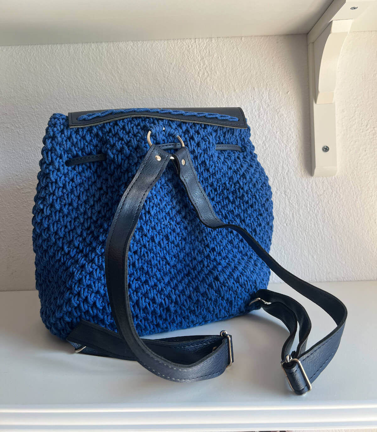 Χειροποίητη πλεκτή backpack τσάντα σε μπλε ηλεκτρίκ αποχρώση εντυπωσιακή και πρακτική. Η ζωντανή της απόχρωση την κάνει να ξεχωρίζει, ενώ η ανθεκτική πλέξη της προσφέρει άνεση και στυλ για καθημερινές εμφανίσεις με χαρακτήρα.