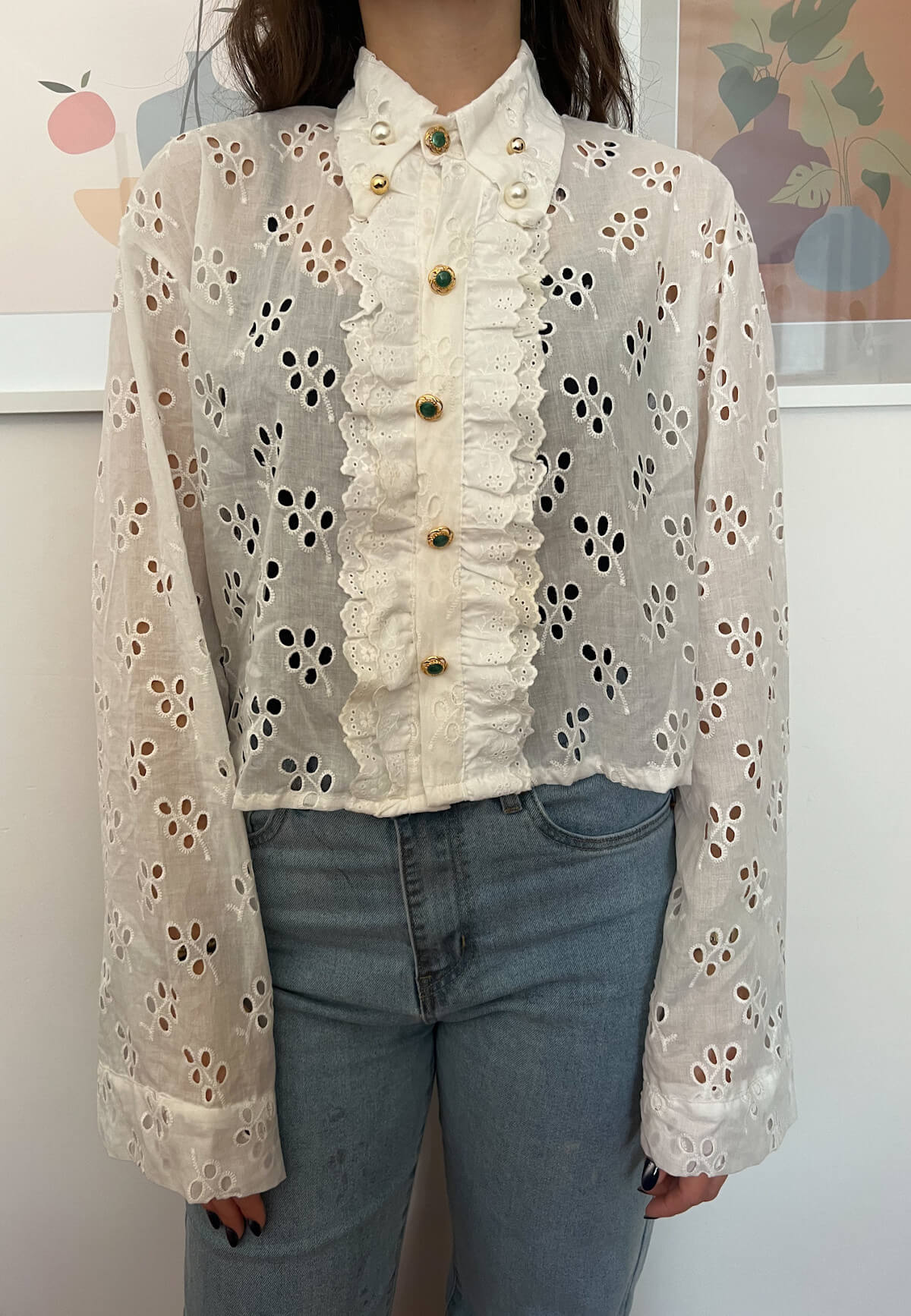 Χειροποίητο λευκό crop πουκάμισο διάτρητο με μανίκια καμπάνα