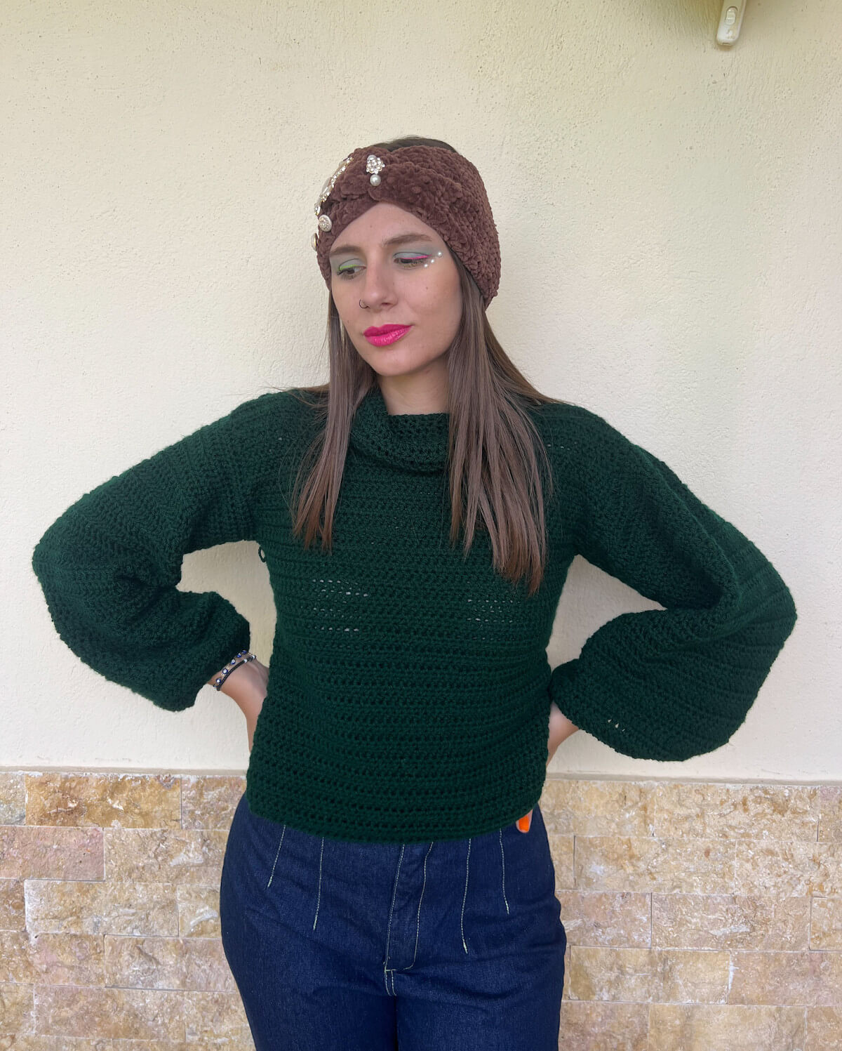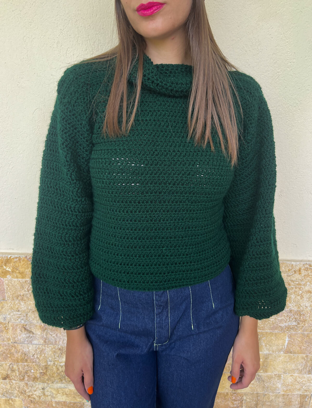 Χειροποίητο πλεκτό πουλόβερ σε βαθιά κυπαρισσί απόχρωση προσφέρει ζεστασιά. Είναι ιδανικό για τις κρύες μέρες, προσθέτοντας μια γήινη και μοντέρνα πινελιά στο στυλ σας.