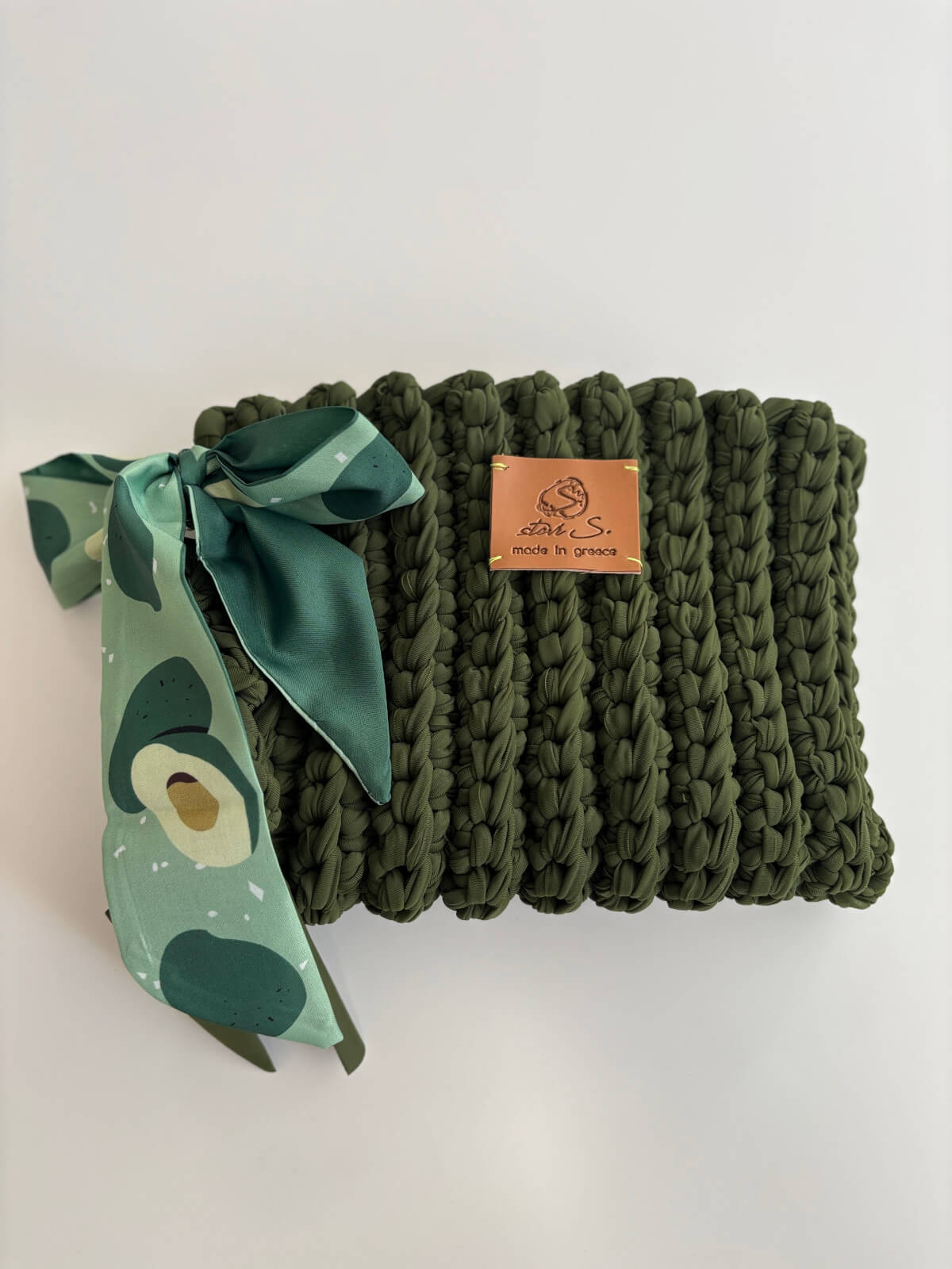 Χειροποίητος πλεκτός φάκελος από νήμα T-shirt σε λαδί χρώμα. Eco-friendly, μοντέρνος και ιδανικός για καθημερινή χρήση ή βραδινές εμφανίσεις.