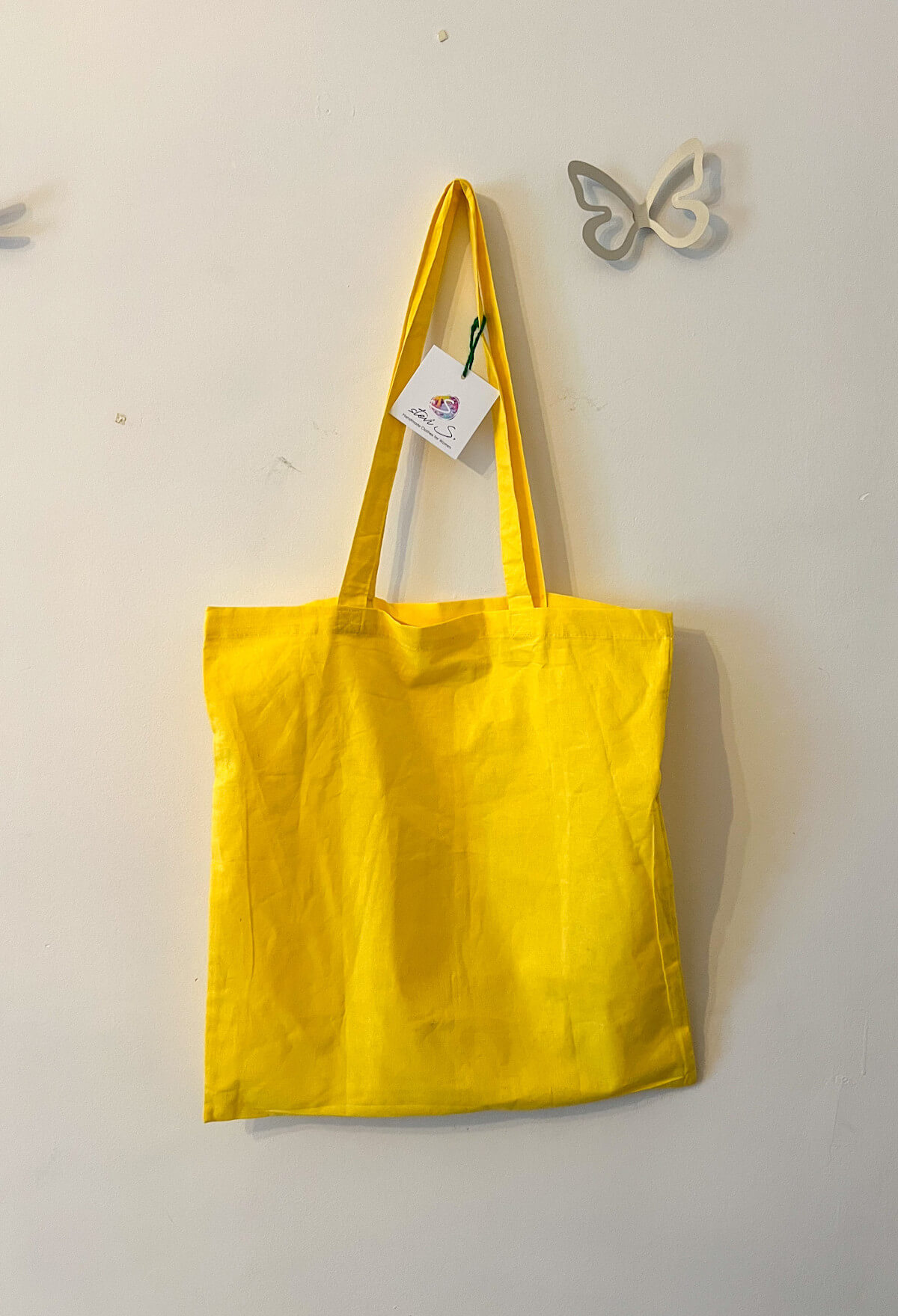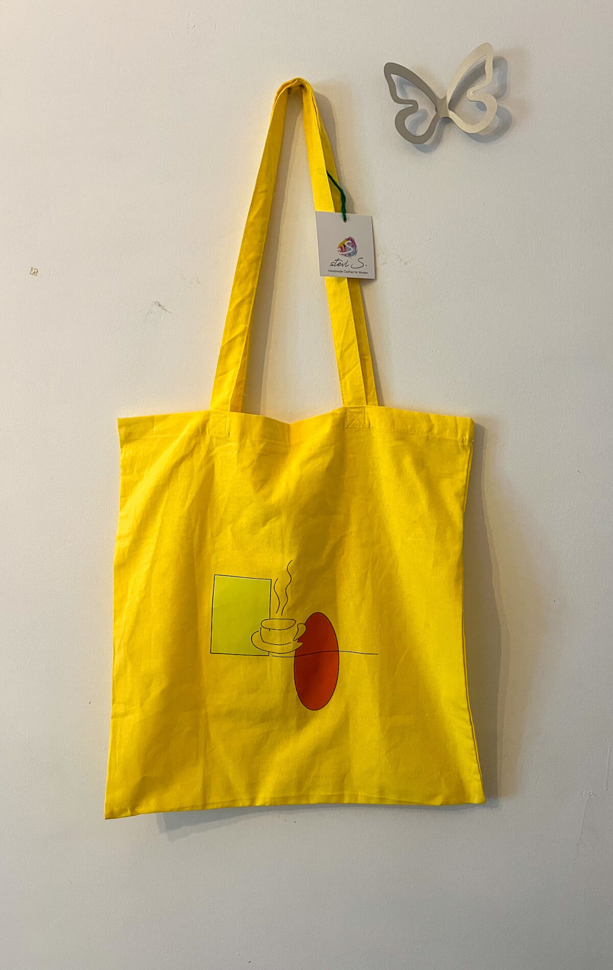 Υφασμάτινη tote bag σε φωτεινό κίτρινο χρώμα με σχέδιο καφέ φλιτζάνι προσθέτει μια παιχνιδιάρικη και ζωντανή πινελιά στις εμφανίσεις σας. Ευρύχωρη και ανθεκτική, είναι ιδανική για την βόλτα, τα ψώνια και την σχολή.